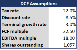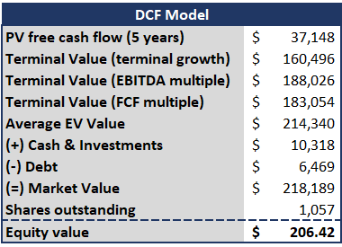 The present value of the free cash flow from 2018-2022 is $37.15 million. The terminal value for the terminal growth rate is $160.5 million. The terminal values for the multiples are $188.0 million and $183.0 million. I average the three terminal values and add the present value of the free cash flow from 2018-2022. The result is an average EV value of $214.3 million. The market value is equal to the enterprise value �� debt + cash & investments. The total market value is $218.2 million. The last step is to divide the market value by the shares outstanding to get the equity value. The equity value ends up being $206.42 or $206 when rounded. The DCF valuation has an 8% upside versus the current share price of $191.