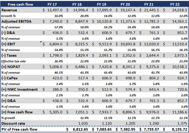 On the revenue front, I forecast 20% revenue growth in 2018 which is in line with guidance provided by Mastercard. I expect the growth to decline somewhat to 12% in FY 2022. I expect the EBITDA margin to increase slowly over the years, primarily driven by the strong revenue growth.